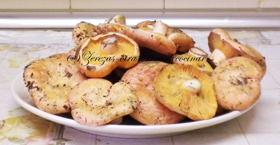 Los níscalos venían sin tierra, pero si con verdín, que hay que retirar, con un paño húmedo y secar bien, cortamos el tronco, reservamos.